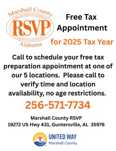 | This Ad Expires: Jan 19, 2026 Misc Free Tax Appointment for 2025 Tax YearJan 12, 2026 Christopher Isaac Marshall County RSVP Free Tax Appointment for 2025 Tax Year Call to schedule your free tax preparation appointment at one of our 5 locations. Please call to verify time and location availability, no age restrictions. 256-571-7734 Marshall County RSVP 19272 US Hwy 431, Guntersville, AL 35976 UNITED WAY Marshall County ® |